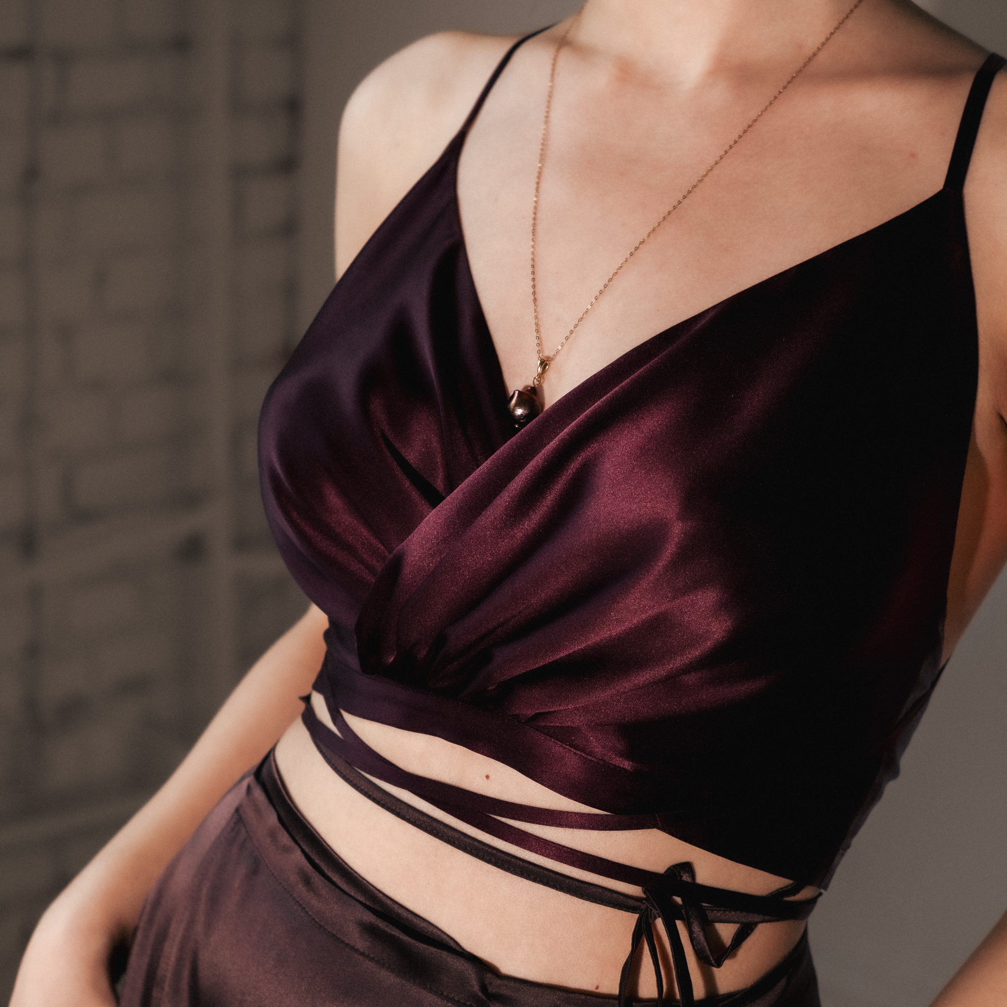 The new Mia top features a draped, wrap-effect bust created by elegantly gathering fabric across the front that flows into a dramatically open back. The beautiful v neckline is finished by thin straps that cross on the back and wrap around the body, accentuating your curves. It is made from buttery silk satin, a luxurious, natural and breathable fabric.